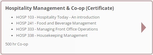 Hospitality Marketing and Sales (Certificate): Este programa é projetado para estudantes interessados em prosseguir carreiras em marketing e vendas dentro da indústria de hotelaria. Uma seleção de cursos de mais de doze semanas dará aos alunos uma visão geral de algumas das necessidades administrativas de uma empresa na indústria da hospitalidade e dará aos alunos as ferramentas necessárias para ter sucesso no campo. Benefícios do Programa